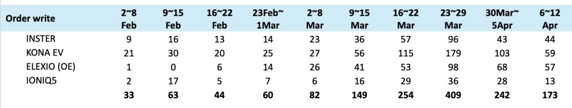 It is also increasing its supply of the small Inster (to 255 from 84), and the Ioniq 5 (to 150 from 96). It says the order level in March and April is triple the level of January and February for the Kona, Inster and Ioniq 5, and more than 10-fold for the Elexio.