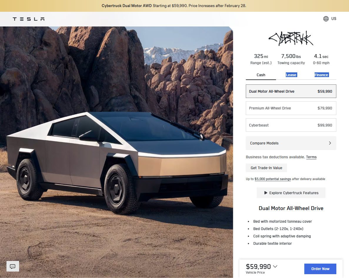 Tesla already signalled a price rise by the end of this week. On the Cybertruck configurator, the company has a pinned header which says: “Cybertruck Dual Motor AWD: Starting at $US59,990. Price Increases after February 28.”
